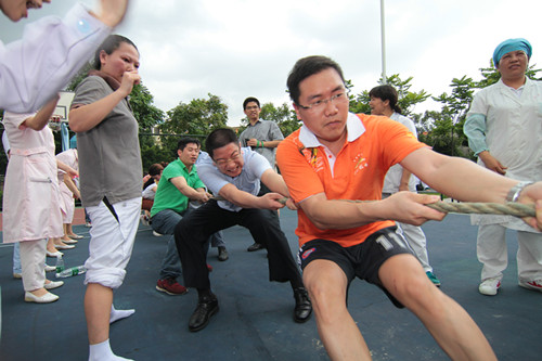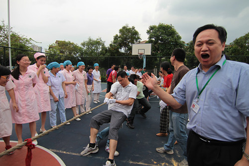 比赛现场加油声、呐喊声、欢笑声此起彼伏。来自各科室的十六支队伍表现出了顽强拼搏的精神,既赛出了水平又赛出了风格。在啦啦队震耳欲聋的“加油”呐喊声中,参赛队员们卯足了劲,涨红了脸,抓紧绳,努力争夺。