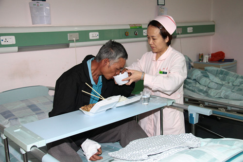 治疗的这一段日子里,领导们百忙中抽空探望,医生精心治疗,细心诊治,护士耐心护理,手不能动,护士帮他喂饭,没人陪床,护士找他聊天……家一般的关爱温暖了潘清的心,他爱说爱笑了。