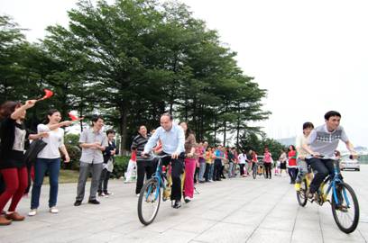下午3:00,比赛在热烈的气氛中准时进行,大家摩拳擦掌,鼓足干劲投入比赛中,现场欢声笑语不断。自行车疾驰而过,选手们任由汗水在脸颊流淌,他们尽情的释放着自己的蓬勃朝气,努力拼搏。受到现场气氛的感染,陈启康院长和陈永韶副书记也和大家一起参加了比赛。