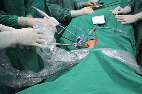 廖伟明医生正在为患者行单孔腹腔镜阑尾切除术