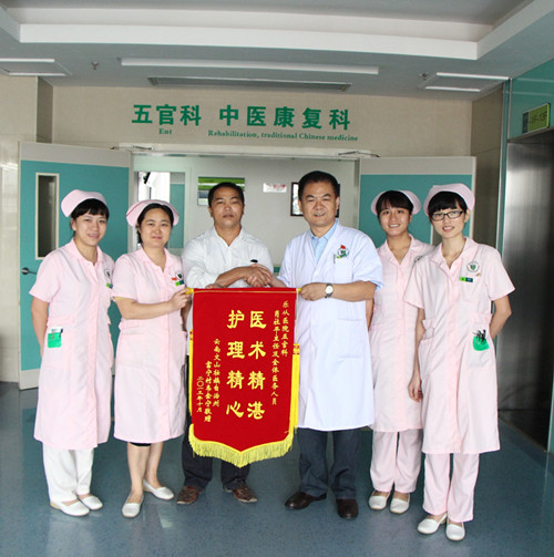 10月17日上午,一位身材魁梧、精神饱满的中年男子手捧一面锦旗来到八楼五官科,仔细一看,原来是刚从五官科出院的韦先生。这次是专程来感谢五官科肖社平主任及科室全体医务人员。看见眼前这位精神抖擞神、神采奕奕的先生,您一定很难将他和手术前的模样联系在一起。