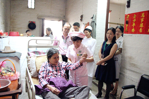 义诊活动中,安博体育副院长陈永韶带领医护人员上门看望常年卧病在床的困难群众,为她检查身体、指导康复并送上慰问品。