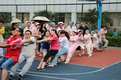 比赛的哨声一响起,队员们双手紧握长绳,憋足了劲拼命往后拉,各个队伍不分上下,每支代表队都展示出最强的比赛阵容,未参赛的员工在旁边助阵加油,整个赛场既紧张又激烈,充分展现出员工们顽强的意志和拼搏的精神。由于许多员工都是工作中抽空前来比赛,所以赛场上竟然出现了一组只有十名男士对抗的比赛。经过激烈的角逐,裁判们依据公平公正的原则,参赛队员本着友谊第一,比赛第二的精神,最终急诊科+口腔科+体检科获得一等奖,办公室+客户服务部获得二等奖,内二科+检验科+供应室获得三等奖。
