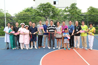 篮球场举办了五月职工运动会暨拔河比赛。比赛将职能、临床、医技部门分成八个小组进行淘汰制晋级比赛,每组由5男、8女共十三人组成。