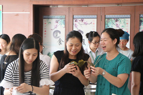 活动开始后,大家都积极的参与其中,更有员工携带自己的小孩、家属一起感受包粽子活动的乐趣。妇产科的罗叶新护士手工相当娴熟,在短短的十分钟,就已经完成了自己计划的20个粽子,一旁正在研究如何包粽子的女员工,纷纷向罗姐学习取经。大家一边精心地设计自己粽子的外观,一边在玩笑中讨论粽子的各类特色性状。参加活动的小朋友认真地向“老师们”提问,自己动手操作。短短的2个小时,大家在欢笑中,完成自己的战利品,宣传拓展部的陈文娟同事并将自己第一个粽子送给同事,将快乐和成果互相传递与分享。