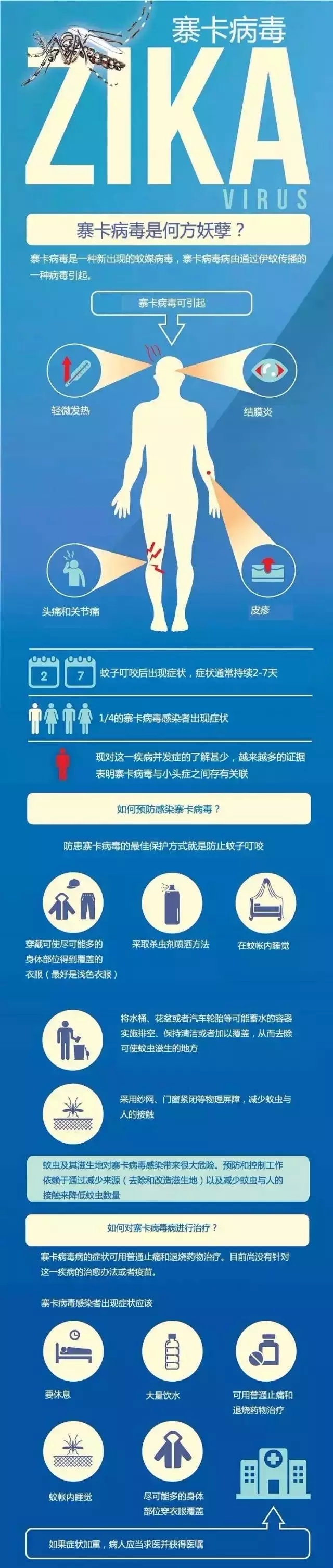 寨卡病毒是一种新出现的蚊媒病毒,目前尚没有特异性治疗办法或者疫苗。最佳预防方式就是采取保护措施,避免蚊子叮咬。