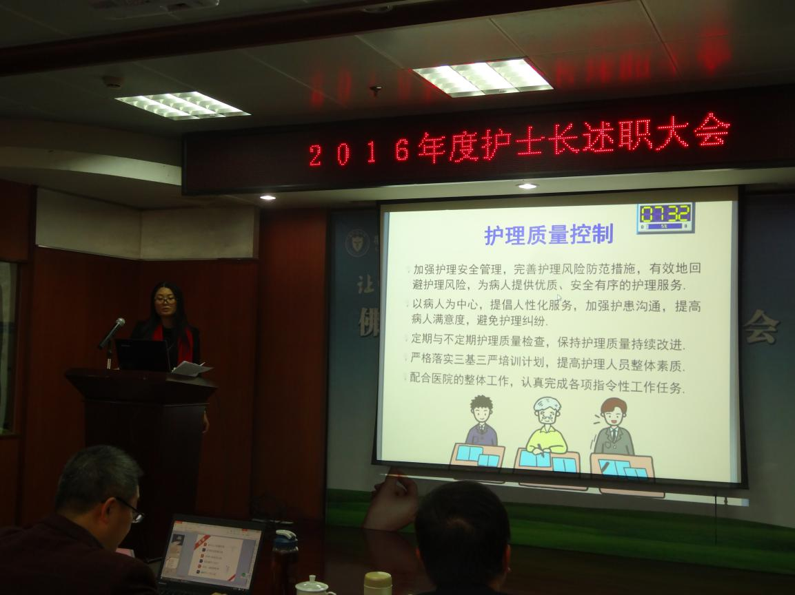 会议期间,护长们采用PPT的形式进行述职,每人限时8分钟。汇报内容分为三个部分:对2016年度护理工作总结、科室的亮点和薄弱环节的分析改进、2017护理工作计划。本次汇报会由15名护士长、1名伤口造口专科护士、1名血透室护理组长进行述职。