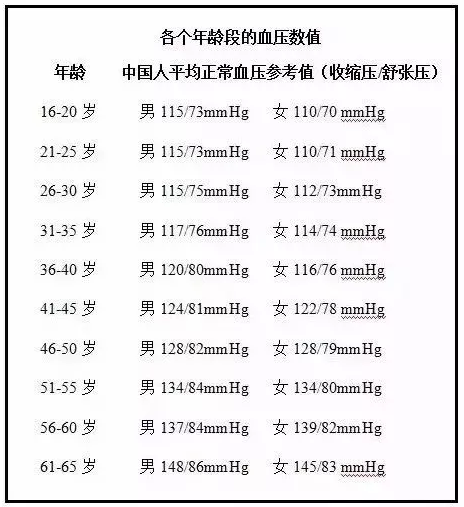 下图是不同年龄的正常血压标准,来对照一下你的血压是否正常吧!