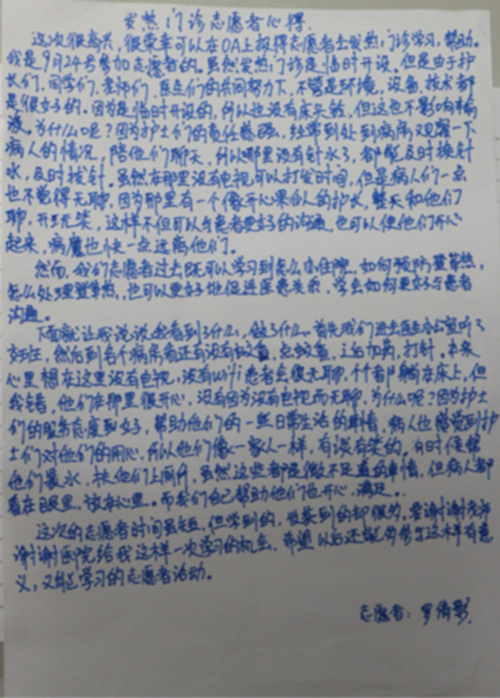 2014-09-26这次很高兴,很荣幸可以在OA上报得志愿者去发热门诊学习、帮助。我是9月24号参加志愿者的。虽然发热门诊是临时开设,但是由于护长们、同学们、老师们、医生们的共同努力下,不管是环境、设备、技术都是很好的。因…