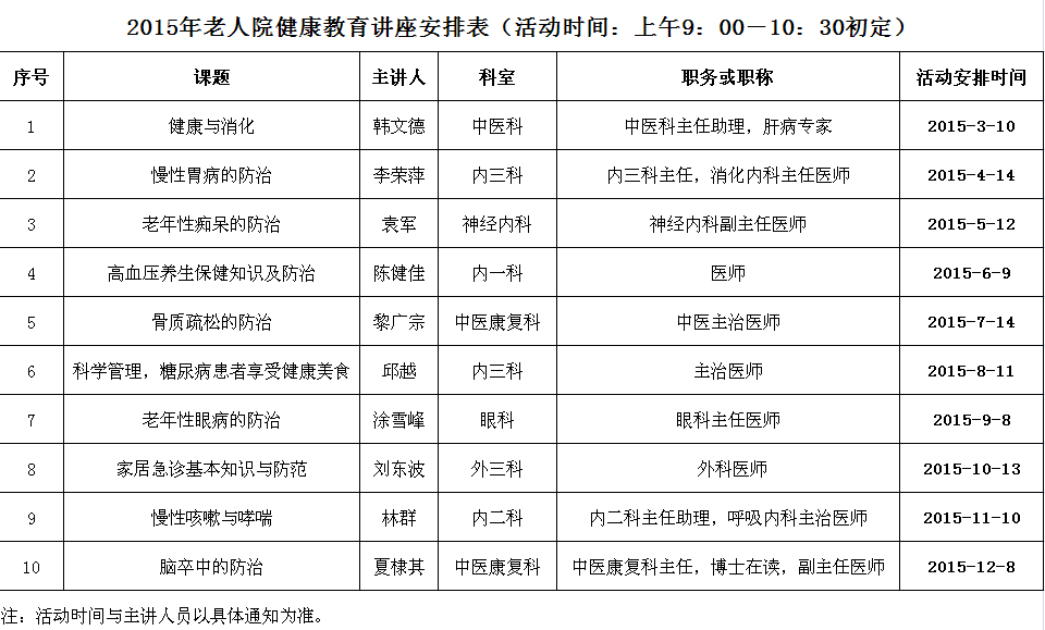 2015年老人院健康教育讲座安排表,欢迎广大群众前往参与!关爱生命,呵护健康